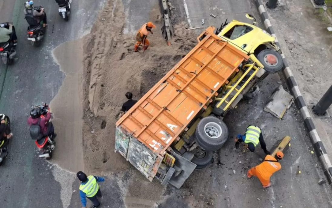Sopir Mengantuk, Truk Muatan Pasir Terguling di Gatot Subroto Tebet
